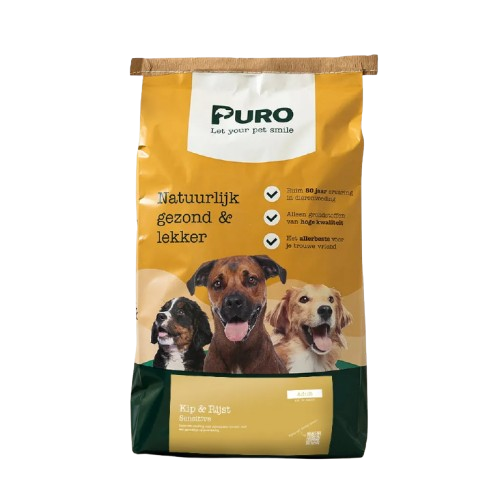 Kippenmeel(28%), ontsloten maïs, ontsloten rijst(18%), johannesbrood, ontsloten sorghum, bietenpulp, rundvet, palmvet, biergist, kokosvet, diatomeeënaarde, zalmolie.