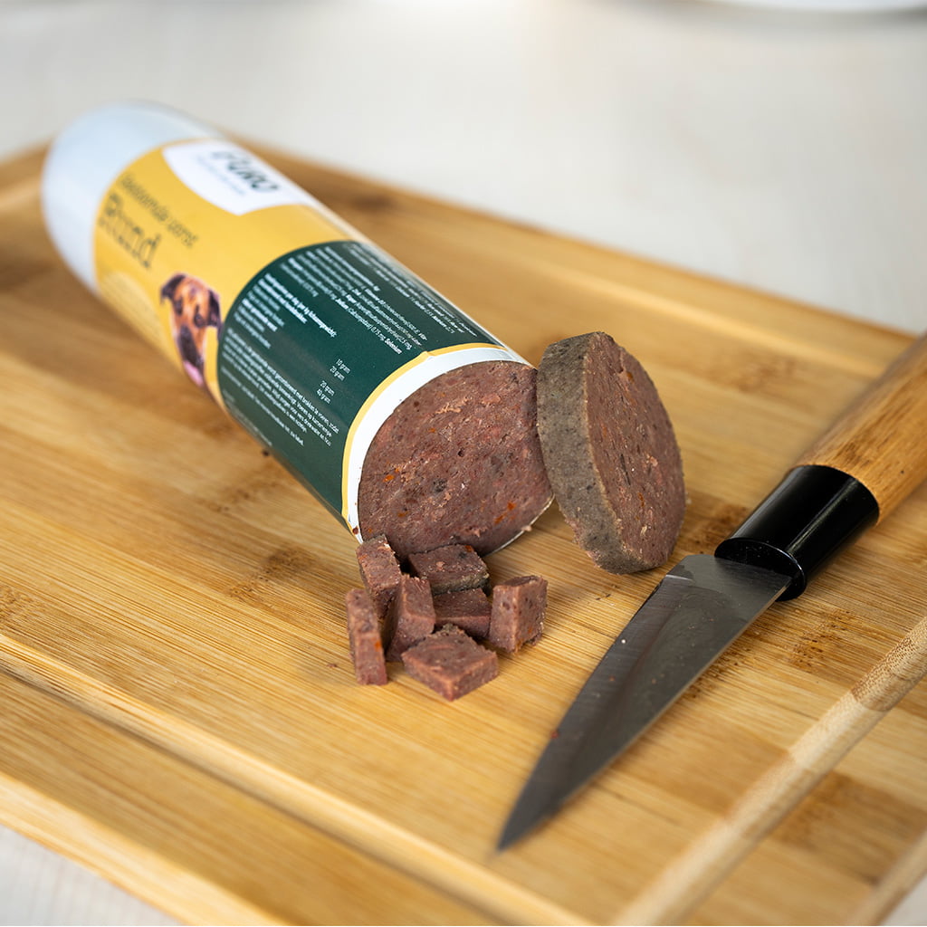 Wij adviseren u de gestoomde worst gecombineerd met brokken te voeren, zodat uw hond van alle voedingsstoffen genoeg binnen krijgt. Voer de worst op kamertemperatuur en in kleine stukjes gesneden. Zorg daarnaast altijd voor vers drinkwater en houd toezicht als de hond eet. Dit voedingsadvies is slechts een richtlijn. De voedingsbehoefte is afhankelijk van de leeftijd, grootte en mate van activiteit van de hond.